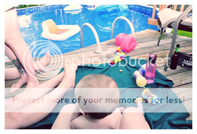 I thought she would love the pool, considering how she lives her tiny baby life for bath time. But the minute her toes touched that water she was screaming. All she wanted to do was sit on the deck in her bathing suit, sunglasses, and floppy straw hat, and play with the old cell phone Mike gave her (since she is always trying to drool all over ours). I find this a deeply disturbing predilection at age 6.5 months.